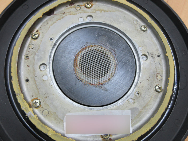 修理前のスピーカー背面。背面バッフルの塗膜劣化、剥がれあり。ネットワークはLX10です