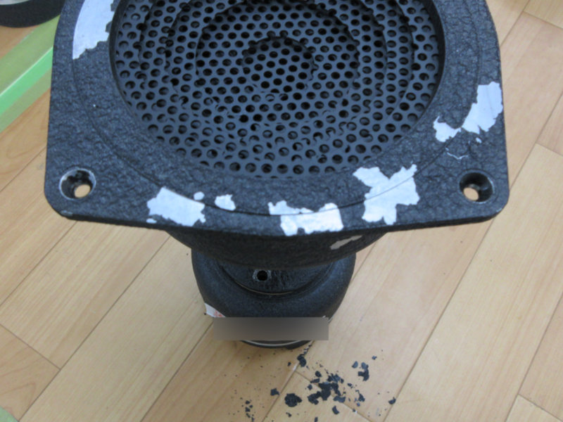 修理前のスピーカー前面。ホーンの塗装剥がれ、ウーハーのエッジ劣化、前面バッフルの塗装剥がれなどが見られます